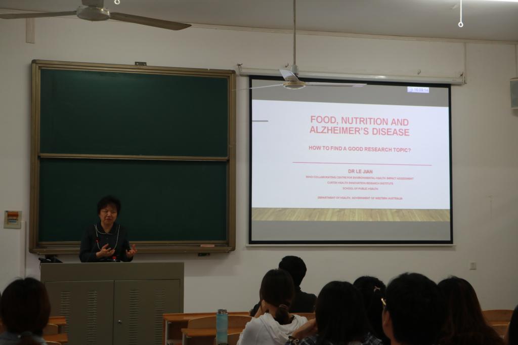 (食品科学技术通讯员 陈欢 供图 陈欢 李萌)2019年10月14日下午16:00,西澳洲卫生部高级研究员和分析师、科庭大学公共卫生学院客座教授JIAN LE 教授在一教303做了一场主题为“Food, Nutrition And Alzheimer's Disease”的精彩学术报告。报告由胡筱波教授主持,yl23411集团多名硕士生参加了此次会议,现场师生积极互动,学术氛围浓厚。