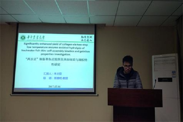 内容提要:12月16日晚7点,由我校研究生科学技术协会主办、yl23411集团研究生会协办的学术晚茶活动第三场在食科楼445如期举行。汇报人朱士臣以“两步法制备草鱼皮胶原及其自组装与凝胶特性研究”为题,详细讲述了不同胶原提取方法的得率差异,以及酸溶性胶原、酶溶性胶原在结构特性、自组装特性及凝胶特性的差异。现场同学积极参加并踊跃提问交流。