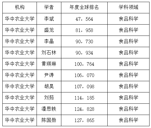 近日,斯坦福大学(Stanford University)与国际权威学术出版社爱思唯尔(Elsevier)共同发布了2025年“全球前2%顶尖科学家”榜单,榜单分为关注整个学术生涯迄今影响力的“终身科学影响力榜单”,以及聚焦本年度学术成就的“年度科学影响力排行榜”。本年度榜单中食品科学领域中国大陆学者共计568位(含两人重复)。其中,我院食品学科潘思轶、李斌、陈国勋、李晶、刘石林、黄琪琳、胡昊、刘茹、尹涛和盛龙等10位教师入选年度科学影响力排行榜(聚焦本年度学术成就),李斌、刘石林、李艳等3位教师入选终身科学影响力榜单(关注整个学术生涯迄今的影响力)。