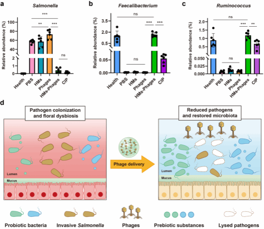 基于此,该团队构建了首个面向“半生命体”(噬菌体)的高效口服递送平台,可精准降低肠道模式病原菌(如沙门氏菌)的数量,并有效避免对肠道益生菌/共生菌的不良影响(图4)。该平台不仅显著增强了噬菌体的体内治疗效果,还实现了肠道菌群的原位精准编辑,兼具“病原菌定向清除”与“共生菌群保护”的双重优势。该项工作为肠道微生态精准调控和噬菌体治疗提供了全新的技术路径,展现出广阔的应用前景和临床转化潜力。