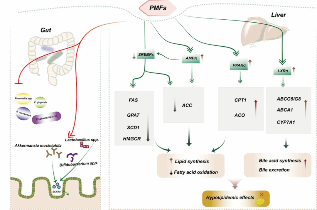 Figure 4. Potential molecular mechanisms of metabolic syndrome regulatory effects of PMFs by lowering lipid effect and modulating gut homeostasis.