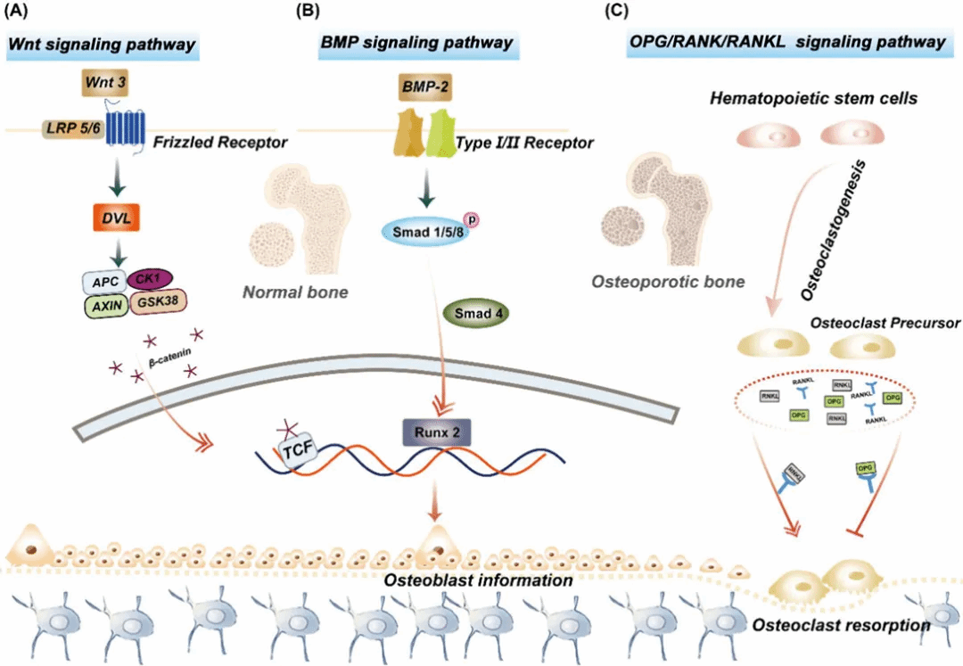 Figure 6. Role of PMFs in two major signaling pathways inducing bone formation (A,B) and inhibiting osteoclast activity (blocking RANKL synthesis) (C).
