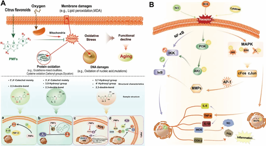 Figure 2. (A) Schematic diagram of free radical theory in aging (upper) and summary of related cellular mechanisms and pathways over prevention from oxidative stress (lower), including structure–activity links of PMFs on their diverse antioxidant activities. (B) Potential anti-inflammatory signaling pathways and mechanisms of citrus PMFs.