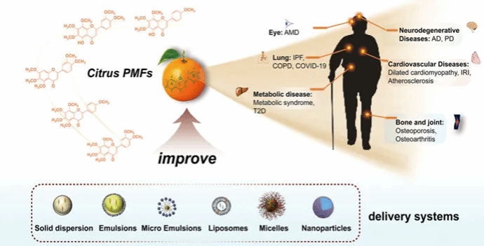 2. 多甲氧基黄酮(PMFs)是膳食类黄酮的一种,因其具有多种生物活性,包括抗氧化、抗炎、神经保护和代谢调节作用,已成为潜在的抗衰老候选物质。本综述总结并讨论了PMFs对衰老的影响,详细阐述了PMFs介导的调节作用与预防或治疗各种衰老相关疾病的可能机制。此外,还从 PMFs 在体内的吸收、分布、代谢和排泄等方面详细讨论了 PMFs 的生物学归宿。特别关注了 PMF 的生物利用率与生物活性之间的关系,因为 PMF 的生物利用率低会严重影响其生物活性。