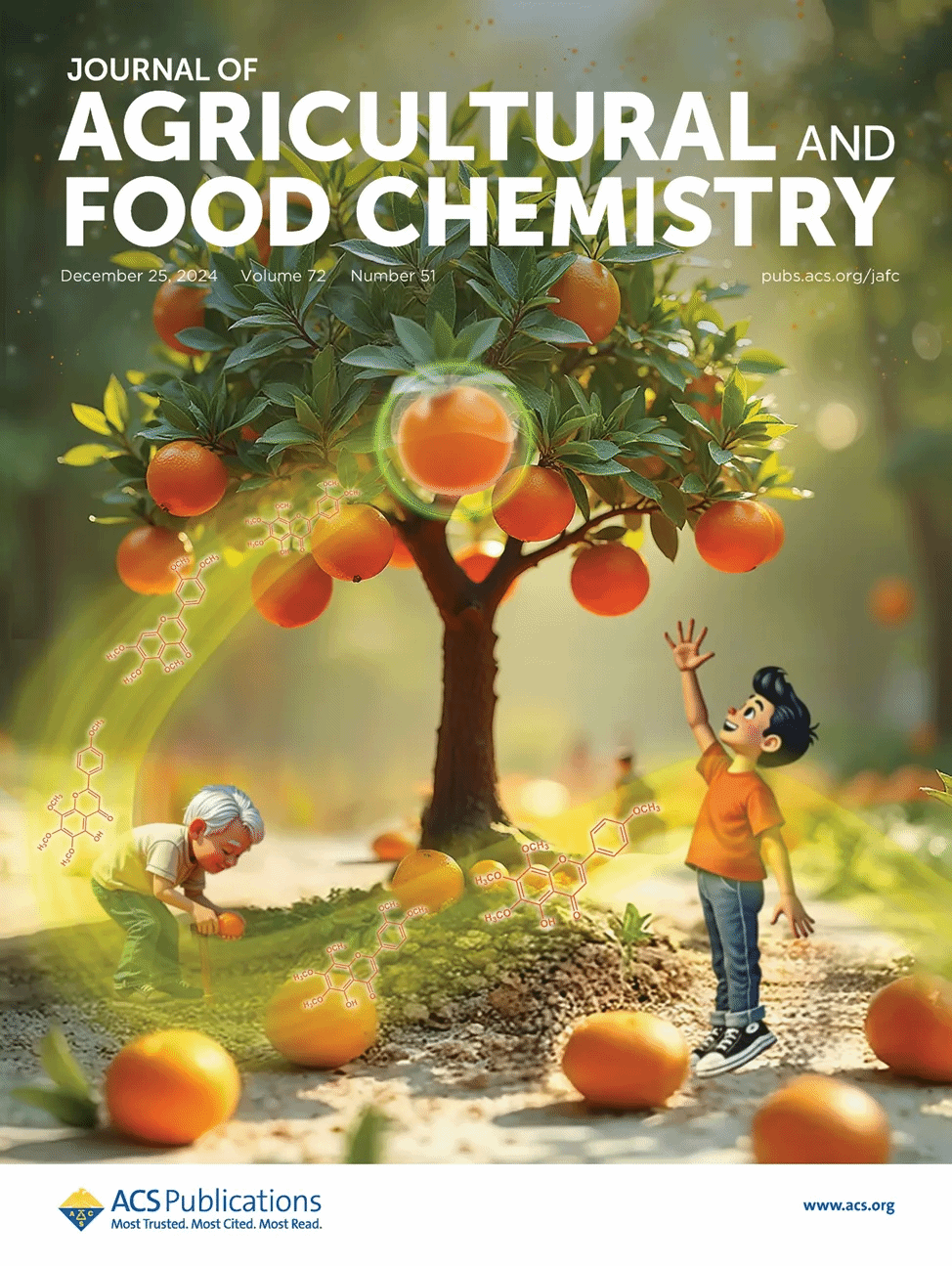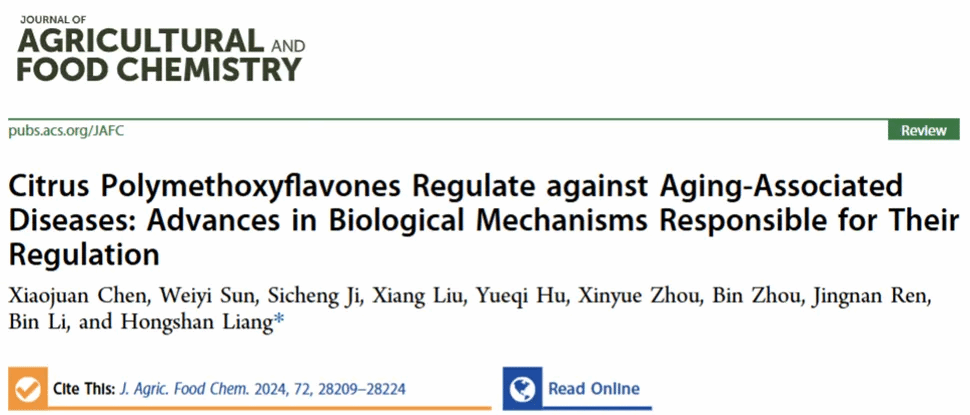 2024年12月11日,yL23411永利集团李斌教授团队梁宏闪副教授课题组在国际食品Top期刊《Journal of Agricultural and Food Chemistry》(Q1,IF=5.7)发表题为“Citrus Polymethoxyflavones Regulate against Aging-Associated Diseases: Advances in Biological Mechanisms Responsible for Their Regulation”的综述论文,2024年12月25日被选为封面论文。