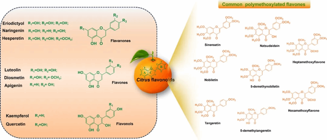 Figure 1. Classification and chemical structures of citrus flavonoids, including representative compounds of commonly studied citrus polymethoxyflavones (PMFs).