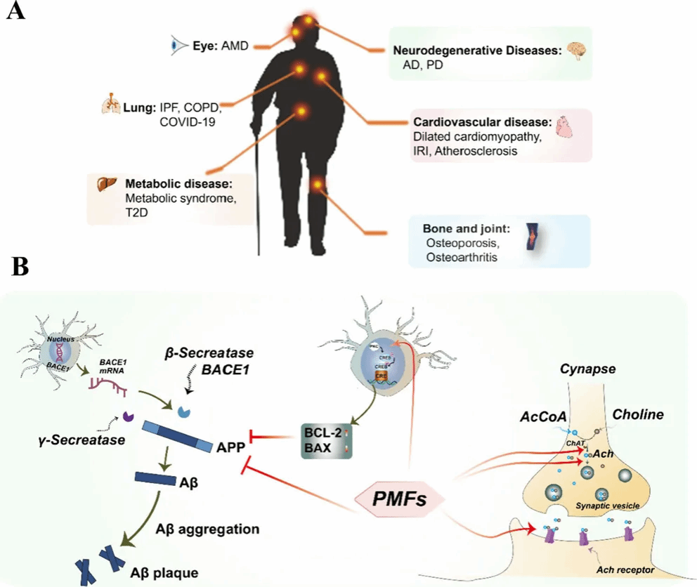 Figure 3. (A) Schematic representation partially of the age-related diseases described grouped by organs or systems. (B) Neuroprotective effects of PMFs and related molecular mechanisms by inhibiting the activities of BACE1, promoting CREB phosphorylated levels and ChAT gene transcription, enhancing the level of ACh and the activity of nAChR.