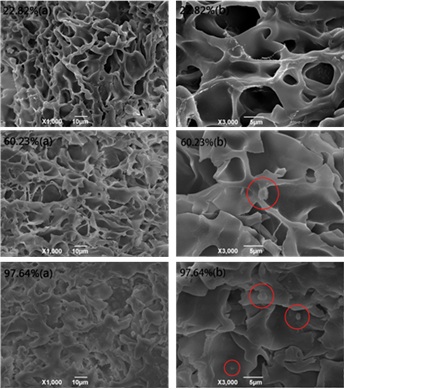 Scanning electron microscopy (SEM) of PAFRs at the amylose ratios of 22.82%, 60.23% and 97.64% (a: × 1000, b: × 3000).