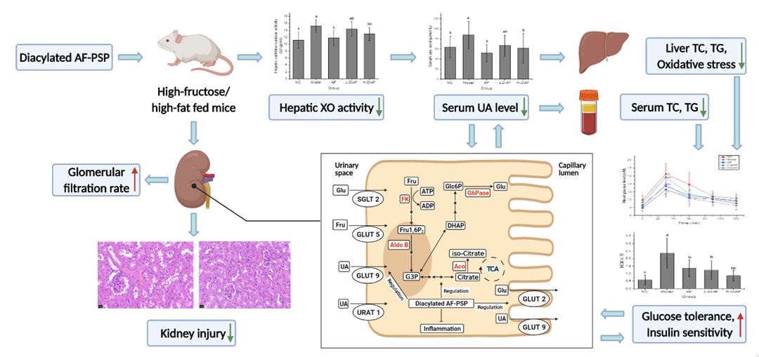 本研究中,研究人员发现紫薯双酰基花色苷纯化物相对于紫薯单酰基花色苷和蓝莓无酰基花色苷纯化物具有较好的α-淀粉酶和α-葡萄糖苷酶抑制作用;紫薯双酰基花色苷纯化物是α-淀粉酶和α-葡萄糖苷酶的混合型抑制剂且竞争性抑制占主导;如图3所示,利用荧光猝灭、3D荧光光谱、圆二色谱等多种光谱学方法研究了紫薯双酰基花色苷纯化物与α-淀粉酶和α-葡萄糖苷酶的相互作用机制,并通过分子对接模拟揭示了酰基基团在其中的作用;紫薯双酰基花色苷纯化物也能够有效延缓大鼠体内淀粉消化。此研究为紫薯花色苷预防和调节高血糖提供了科学依据,也为将紫薯花色苷作为原料应用于高附加值功能性食品提供理论基础。目前,该团队发现利用紫薯双酰基花色苷纯化物干预能够通过抑制高果糖高脂饮食小鼠的肝脏XO酶活性降低血尿酸,从而缓解高脂血症、非酒精性脂肪肝和肝脏氧化应激,进而改善胰岛素抵抗;同时调节果糖代谢相关酶mRNA的表达并降低肾脏果糖、葡萄糖和尿酸的重吸收相关转运蛋白表达水平、缓解肾脏炎症反应,进而减少肾脏病理学变化、减轻肾脏负担和损伤(图3)。紫薯花色苷展现出在改善高果糖高脂诱导代谢综合征和缓解肾脏损伤中良好的应用前景。
