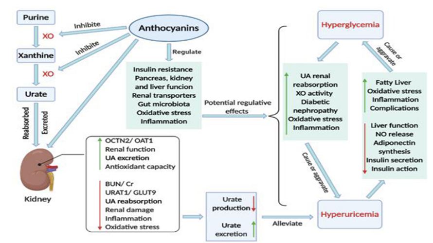图2高尿酸血症与高血糖的联系,花色苷的降尿酸作用及其对代谢综合征的潜在调节作用