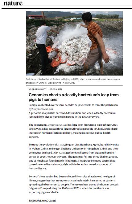 近期,我院yl23411集团/交叉科学研究院/生物医学与健康学院李锦铨研究员及团队,在基础和转化医学国际顶级期刊《欧洲分子生物学会•分子医学》(EMBO Molecular Medicine)上发表了题为《与人类感染相关的新型猪链球菌分支在全球出现(The global emergence of a novel Streptococcus suis clade associated with human infections)》的研究论文,引起了领域内的高度关注。7月7日出版的《Nature》杂志以研究亮点(Research Highlight)的形式跟踪报道了这一研究成果。