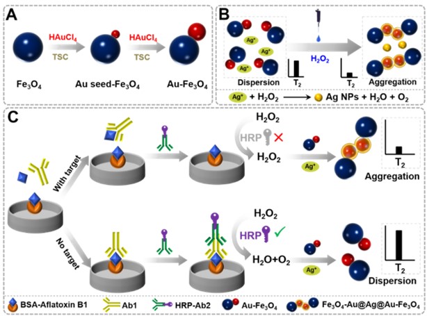 针对上述难题,陈翊平教授课题组设计并合成了一种哑铃状的Au-Fe3O4纳米磁颗粒,并以其为磁探针,引入了一种过氧化氢(H2O2)介导的磁颗粒组装策略,将分散的Au-Fe3O4纳米磁颗粒组装为聚集态的磁颗粒簇,进而引起体系横向弛豫时间(T2)的变化。基于此策略,研究人员开发了一种新型的磁弛豫免疫传感器,并将其用于黄曲霉毒素B1的灵敏、稳定分析。