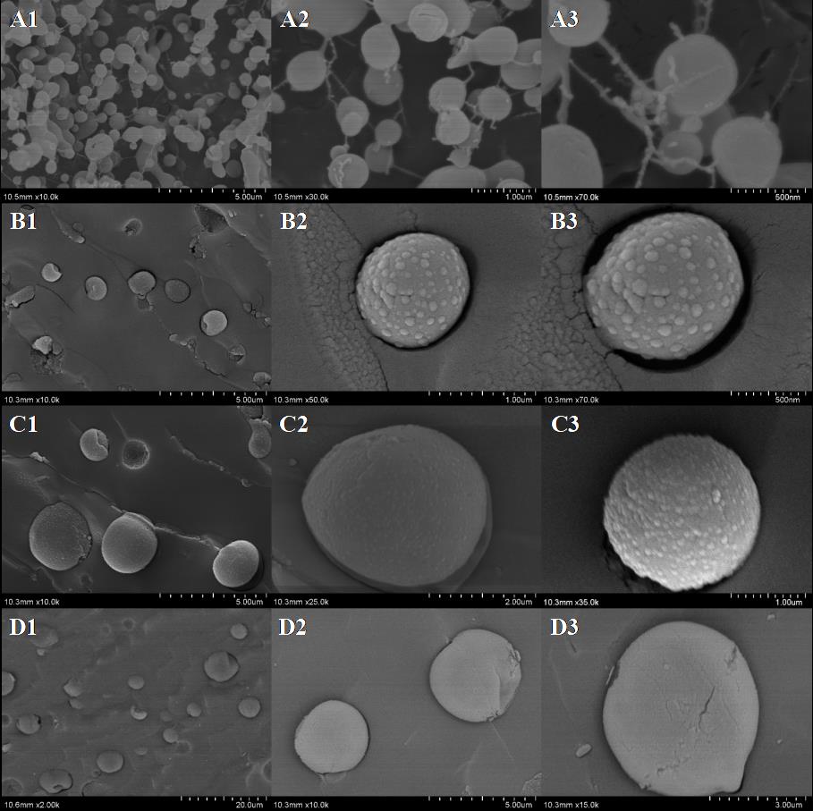 图3 果胶乳液的冷冻扫描电镜形态:(A): 柿果胶; (B) 甜菜果胶; (C) 高酯化柑橘果胶; (D) 低酯化柑橘果胶.