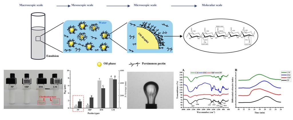 此研究从多角度系统确证了柿果胶极强的乳化活性和乳化稳定性,并系统揭示了其发挥强乳化活性的独特机制,研究结果为柿果胶作为天然来源乳化剂的应用提供了科学依据,也将我国柿子资源优势转化为经济优势提供参考。