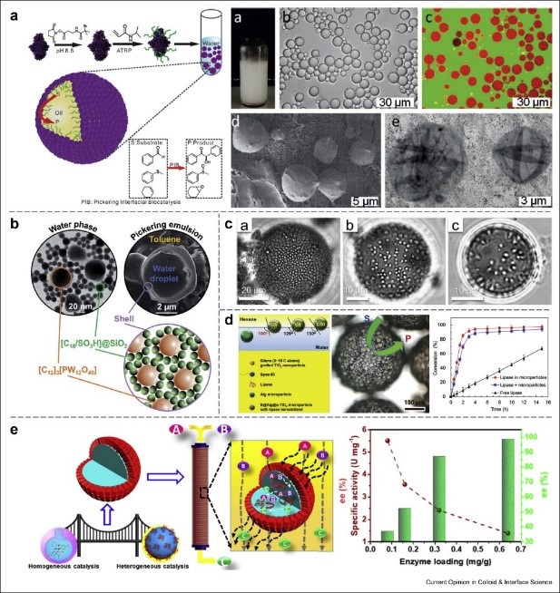 Pickering乳液因其稳定性高、界面面积大、产品易于分离和催化剂回收容易而被认为是界面催化的优良平台。因此,Pickering乳液的界面催化研究是Pickering乳液应用研究的热点。已经有研究将不同的催化剂甚至酶包封在Pickering乳液中以提高催化反应速率,这表明Pickering乳液的应用实际上是保持生物催化剂活性和提高催化性能的有效途径。近年来,研究人员在该领域不断取得突破,使得Pickering乳液催化研究中的级联催化和界面催化越来越受到关注(图6)。