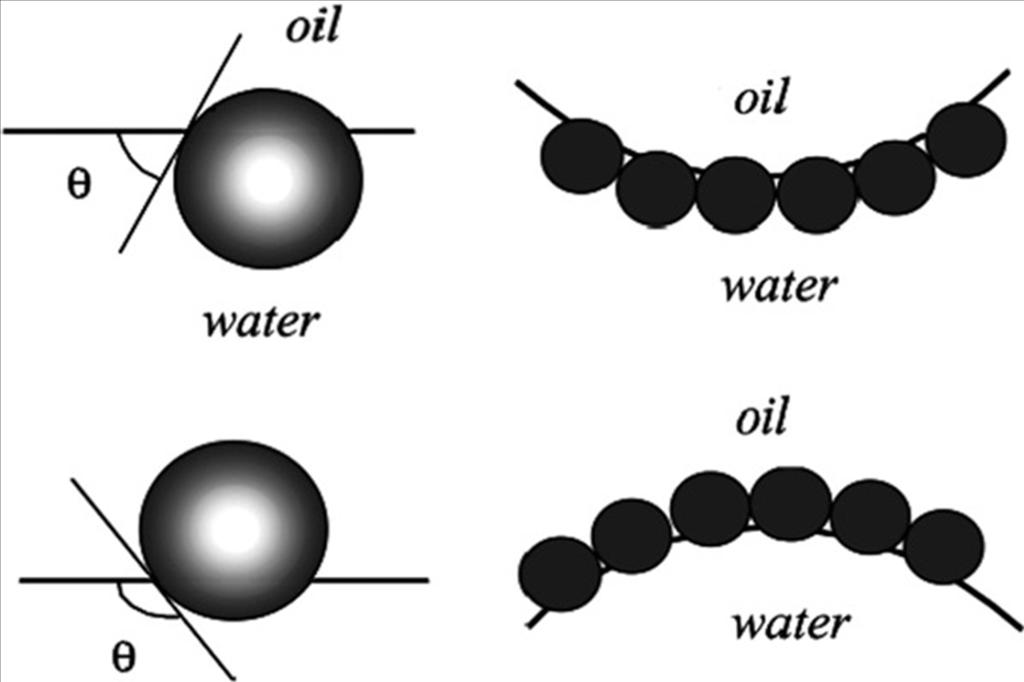自从Pickering稳定的乳剂最初在一个世纪前被披露以来,稳定机制已经被系统地评估。界面面积的减少是颗粒在两相界面聚集的主要动力来源。天然蛋白质分子倾向于从界面上解吸,因为捕获能量与促进布朗运动的热能相当,因此天然蛋白质分子在两相界面上显示出快速交换,这与颗粒的吸附行为形成对比。吸附在界面上的颗粒几乎不能移动,表明颗粒被界面上的界面能所捕获。与蛋白质分子的两亲特性相反,颗粒的润湿性是决定皮克林稳定机制的主要因素。许多研究表明,要获得稳定的皮克林乳液,颗粒的润湿性是最关键的因素,由三相界面的接触角θ来量化,如图1所示。