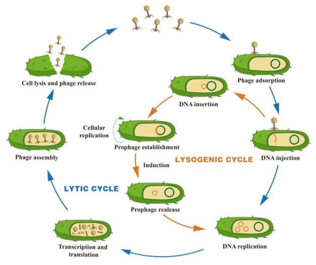 图2 噬菌体的裂解周期(蓝色箭头)和溶原周期(橙色箭头)