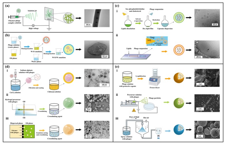 然而,作为一种“活体抗菌剂”,噬菌体的衣壳蛋白和核酸在胃肠道的苛刻条件下极易发生变性和降解,进而造成其感染能力和生物学功能的丧失。近年来,随着材料科学的进步,不同的载体已经被制备用于包埋和递送噬菌体,以提高噬菌体在结肠递送过程中的稳定性。这些载体包括:电纺纤维、乳液、脂质体、水凝胶和固体颗粒(图3)。通过合适的包埋载体,噬菌体能够在胃肠道转运过程中最大限度保留其活力、精准定量,并实现结肠的靶向释放,在不干扰肠道共生菌和益生菌的前提下裂解病原微生物或调控细菌的特定基因,促进肠道稳态的恢复,进而干预和治疗相关疾病。在本综述中,作者详细论述了各类噬菌体包埋递送载体的制备方法,结构特点以及存在的不足。同时,系统讨论和总结了近年来噬菌体包埋递送的研究现状。最后,该综述还对噬菌体包埋递送领域现存的一些问题提出了相应的解决方案,并对噬菌体递送和肠道菌群编辑未来可能的研究方向进行了展望。