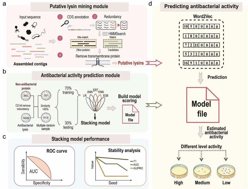 本研究开发了一站式的裂解酶发掘和活性评估软件“DeepLysin”,该软件能够利用人工智能识别抗菌候选蛋白在高维特征的细微差别,实现从“暗物质”中有效筛选裂解酶候选物(图1)。