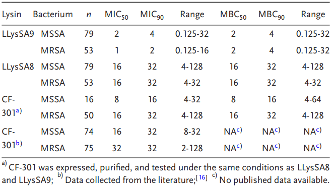 表1 裂解酶LLysSA9与CF-301的最小抑菌/杀菌浓度比较