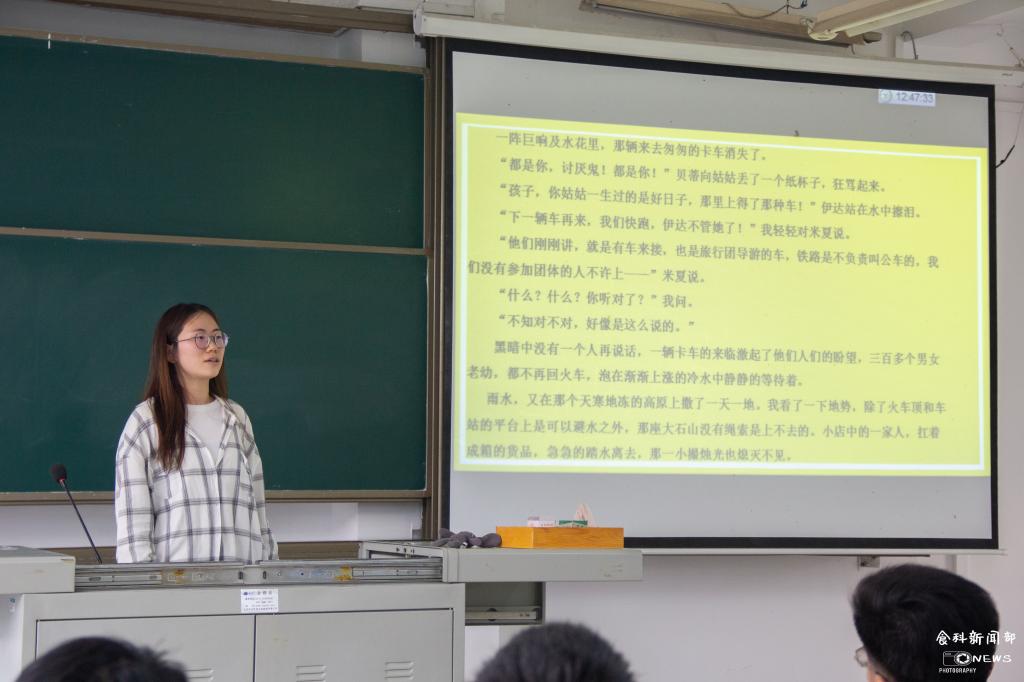 随后,赵宇欣与大家分享了三毛的《万水千山走遍》。她介绍了该书的主要内容:该书记录了三毛返台后,再度出走,游历中南美洲以及首次回归故土的旅行见闻。她表示自己最爱三毛的一句话,“我爱哭的时候便哭,想笑的时候便笑,只要这一切出于自然。我不求深刻,只求简单。”她认为三毛活得恣意洒脱,她的文字总有一种自由的味道。随后,赵宇欣向同学们分享了自己的感悟:“三毛虽然是一个四处漂泊的女人,但却有着四海为家的气度,她的漂泊与常意不同,她的游历令人羡慕。”最后,她以三毛的一句“生活是好的,峰回路转,柳暗花明,前面总会有另一番不同的风光。”结束了分享。