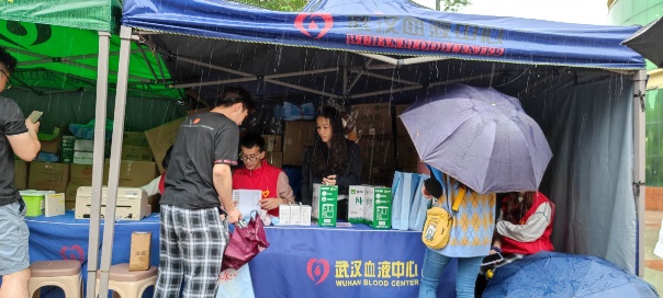活动进行时,26日上午10点,武汉血液中心的献血车停靠在献血地点荟园食堂前坪。天空下起了暴雨,但负责主要任务的几位党员早已经到达工作岗位,帮助献血中心的医护人员进行准备工作并学习献血流程操作知识。