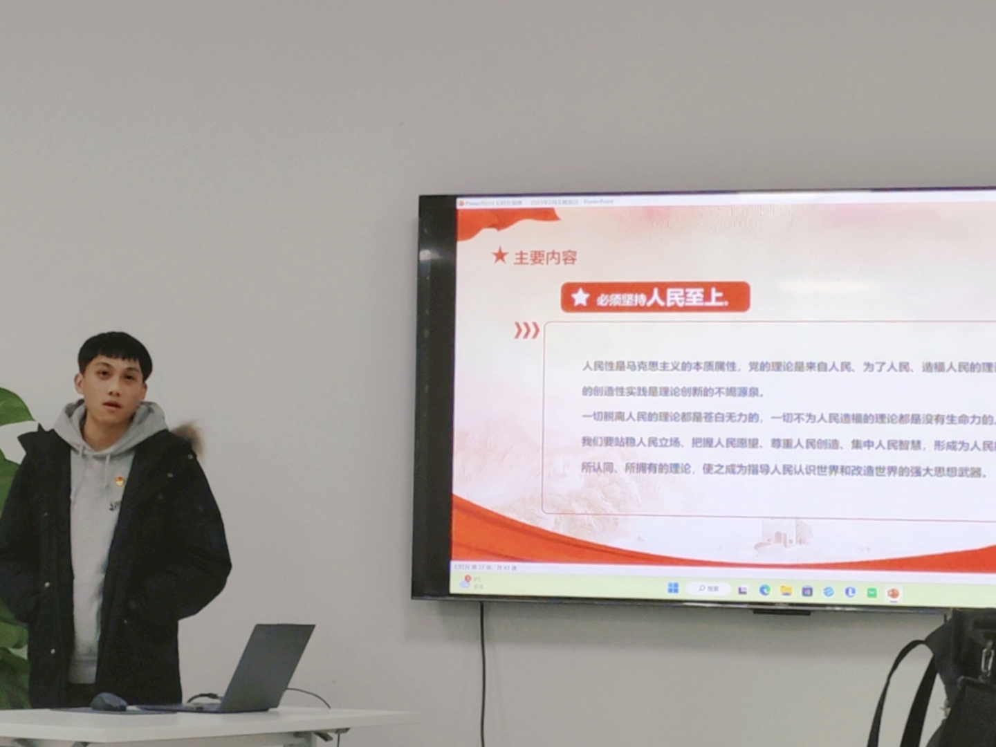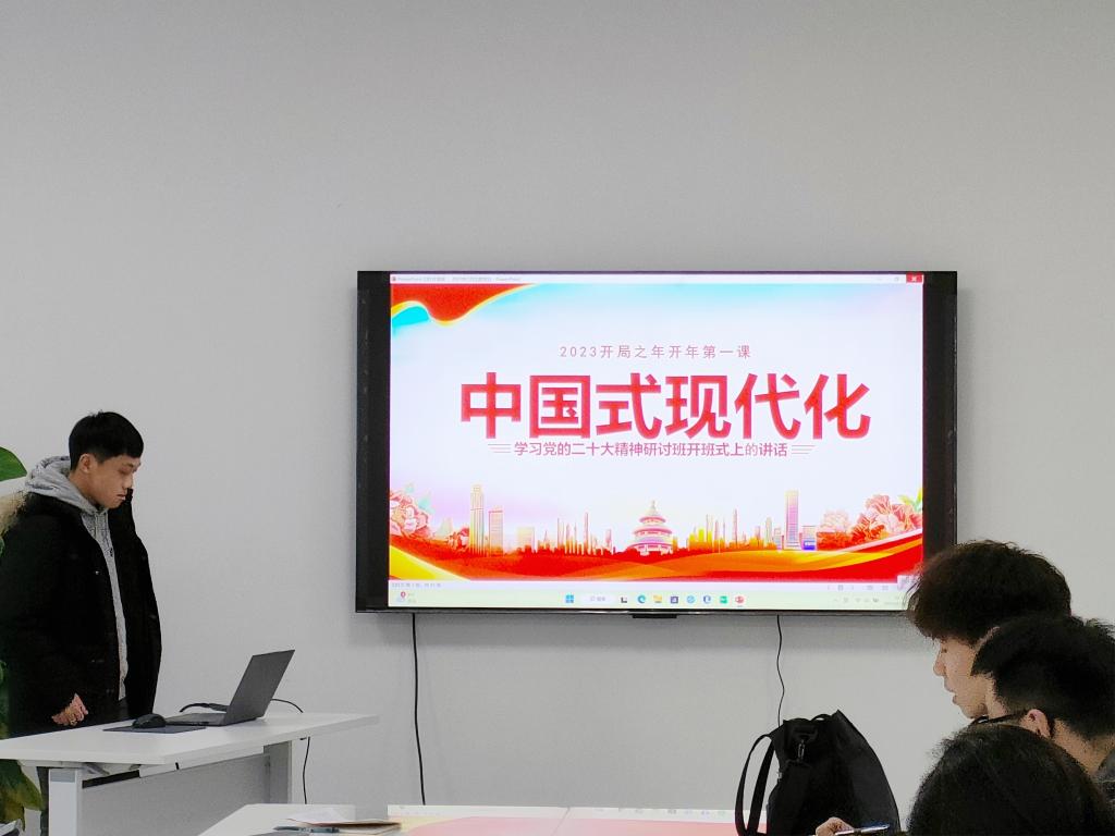认真学习宣传贯彻党的二十大精神,事关党和国家工作全局,事关中国特色社会主义事业长远发展,事关最广大人民的根本利益。为引导研究生党员把思想和行动统一到党的二十大精神上,2月24日中午,yl23411集团研究生第七党支部开展二月主题党日活动,共同学习习近平主席在学习贯彻党的二十大精神研讨班开班式上的重要讲话,并以此为基,更加深入地学习中国式现代化的本质特征以及“坚持人民至上”的理念。会议在工科楼120会议室进行,由研究生第七党支部书记丁一峰主持。