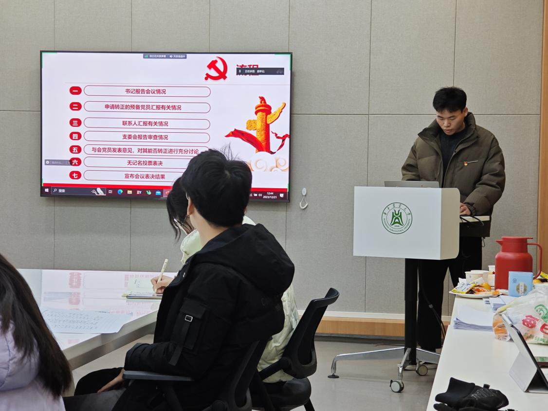 首先由苑祥昊同志报告出席会议的党员人数及注意事项,申请转正的预备党员徐亚伟汇报自己在预备期的表现,向党组织表明态度与决心,随后入党联系人介绍其在预备期间的教育及考察情况并提出转正意见。后经支委会报告预备党员在预备期间的相关情况并发表意见、与会党员发表意见、拟转正预备党员对讨论情况表明态度后,以无记名方式进行表决,支部党员大会同意徐亚伟同志转为中共正式党员。