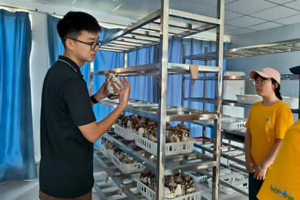随后,在董志雄老师的带领下,团队成员参观了香菇学院实践基地,近距离观察了“拌料——套袋——打孔——灭菌——接种”的整套菌棒制作设备。参观过程中,食工2301班何淑丽同学注意到菌种培养瓶出现棕色斑点,立即向老师请教。老师从杂菌污染防控、温湿度调控等专业角度进行了详细解答,使团队成员对食用菌栽培技术有了更清晰的认识。