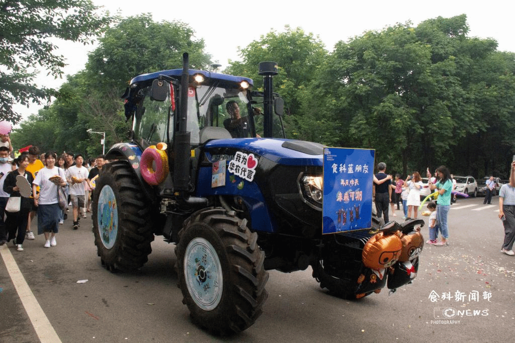 我院机械农机位于五号位置,各类食品图片装点的轮胎、一些诸如“干饭人干饭魂”的醒目标语无一不展现着我院“民以食为天”的特色主题。游行的过程中,杨铁贵书记在最前方引领着大家前行,广大师生挥舞着不同标语的毕业手牌。沿途中也有不少的同学被吸引,纷纷加入队伍参与游行,大家的热情在引擎的轰鸣声和师生的欢呼声中持续高涨。