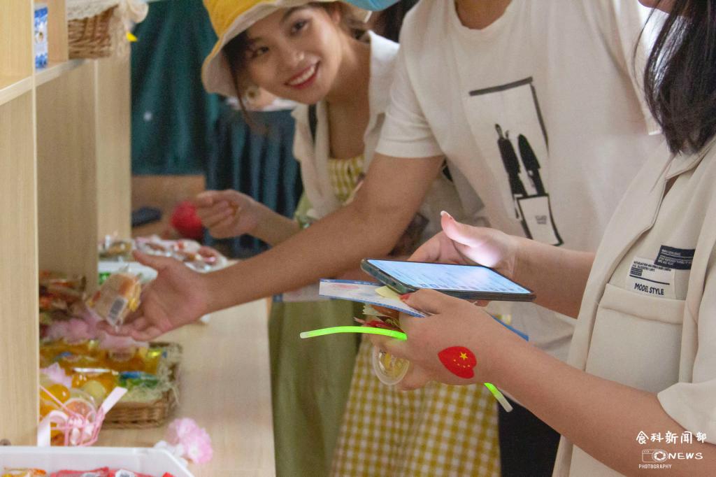 走至户外,“心想事橙”的橙色区的志愿者正向同学们提供啤酒以及“食汇码头”的熟食炸物等冷餐。蓝色区的露天影院正在播放影片,蓝色代表“碧海蓝天” ,同学们在这里尽情歌唱,进行听歌识曲等小游戏。最后,毕业生通过在每个区域参加活动进行盖章打卡,凭盖章在紫色区兑换丰厚的礼品,奖品包括拍立得相片、精美挂件、行李牌等精美的文创产品。