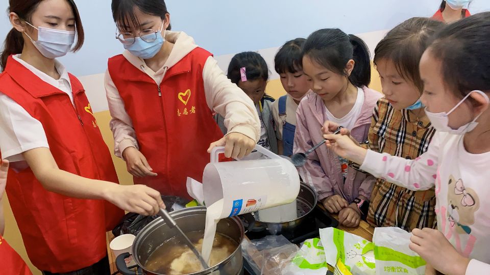 志愿者现场教小朋友们制作奶茶,在享受奶茶的同时,让小朋友们正确辩证看待奶茶的利弊。