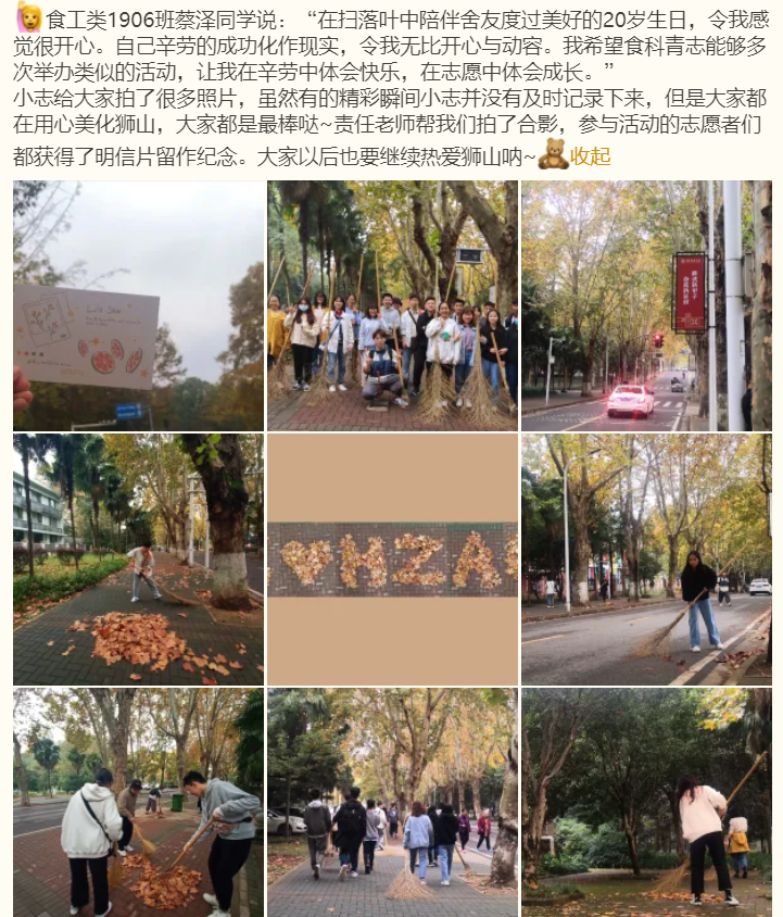 食科一家人志愿服务队每个月在金鹤园举办了环境保护类志愿服务活动,大学生志愿者们对金鹤园社区内的生活垃圾、废弃物、白色垃圾等进行清理。活动以社区为平台,志愿者们深入社区开展垃圾清理,呼吁社区居民共同清扫,增强居民的主人翁意识,以减少各类传染病的发生,改善社区卫生环境,提高居民环保意识和健康素养。