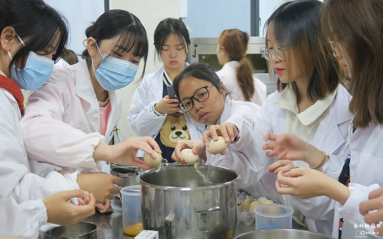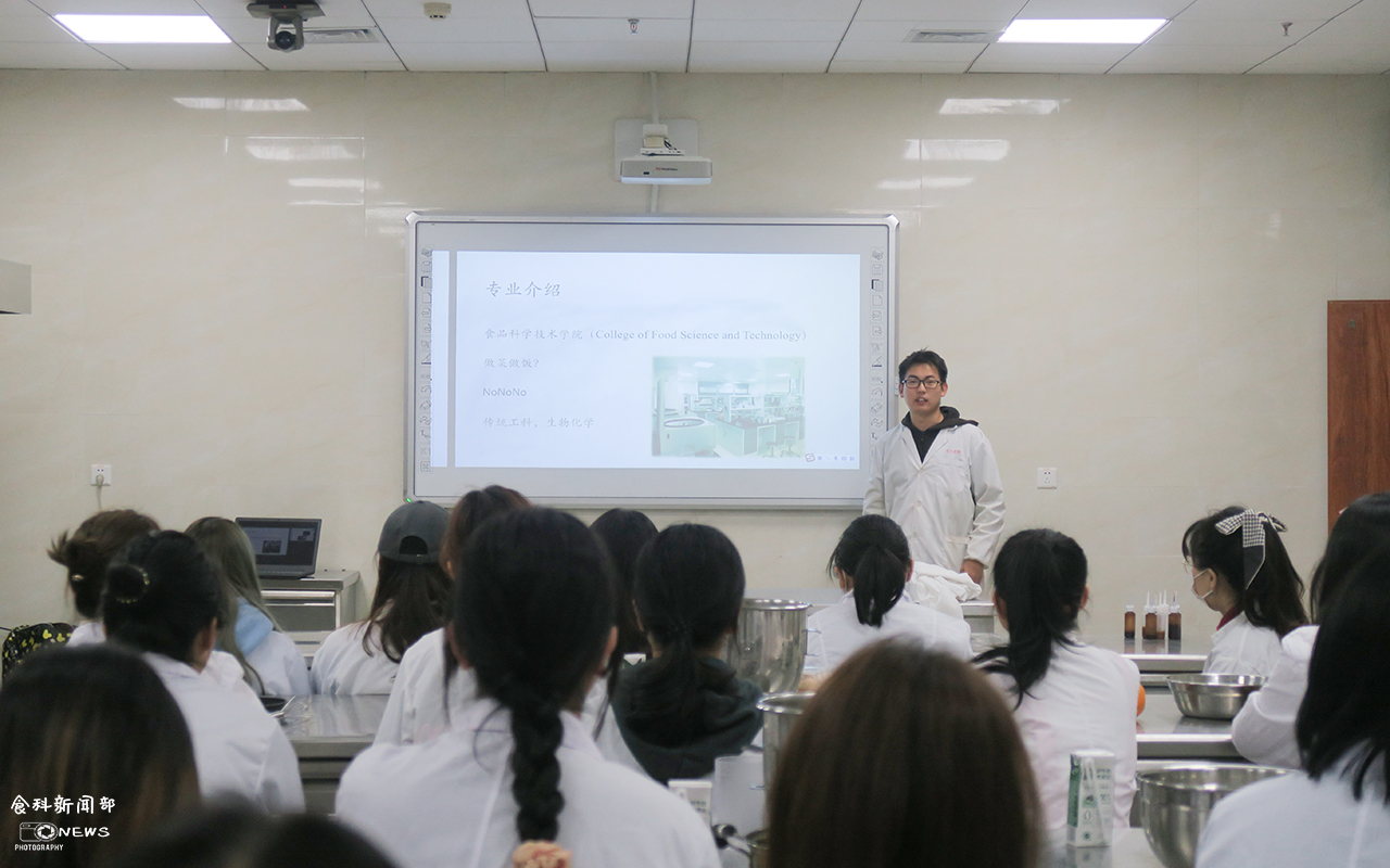 活动伊始,食工1902班吉泽阳向同学们介绍了食科专业的基本情况,让外专业同学对食科有了更多认识。随后,食安1902班余沛霖对香柠西柚蛋糕卷的配料及制作方法进行了讲解,着重强调了蛋清蛋黄分离操作技术的重点。
