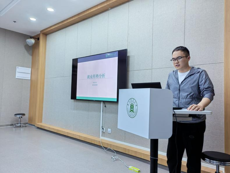 刘涵斐提出了“慢就业”的概念,并向大家分析了“慢就业”会带来的影响,例如其可能会造成待业时的心理压力、影响企业对于非应届毕业生的接受度、导致出现越来越激烈的就业竞争压力等等。随后,刘涵斐还分析了我院18级同学的考研、考公、就业情况,并指出,年年都是“史上最难就业季”,而更难的往往是下一年,他希望大家在任何岗位上都要始终保持一颗上进、学习的心,多给自己的未来留一些选择,不要孤注一掷。