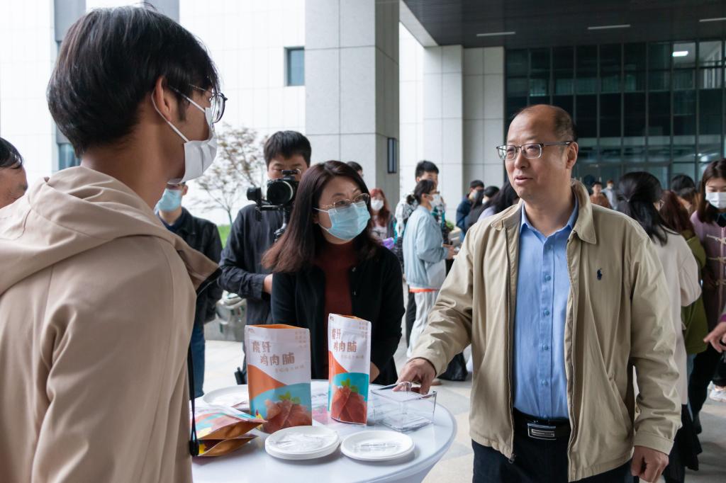创新赛事推动产教育人双提升。2022年“扬翔食品杯”肉类主题加工创意大赛以“安全、健康、美味”为主题,为培育食品工业创新人才,增强学生动手实践能力,开发具有创新性及商业价值的健康产品提供了平台。其中“棋鱼记”将鱼鳞变废为宝,做到了“低糖、低钠、低脂”的健康特点。“只‘薯’于肉,香香脆脆肉多多”则混合了鸡、鱼、肉,形似薯片,具有香香脆脆的口感与独特的创新设计,进一步实现了商品化的可能。在活动现场同步进行的食品营养与健康新专业推介直播也吸引了线上线下的大量观众,我校研究生院常务副院长、教授李斌以食文化节为依托就新专业的师资力量、学习内容、专业优势、深造方向等方面与线下同学和线上网友热切交流。
