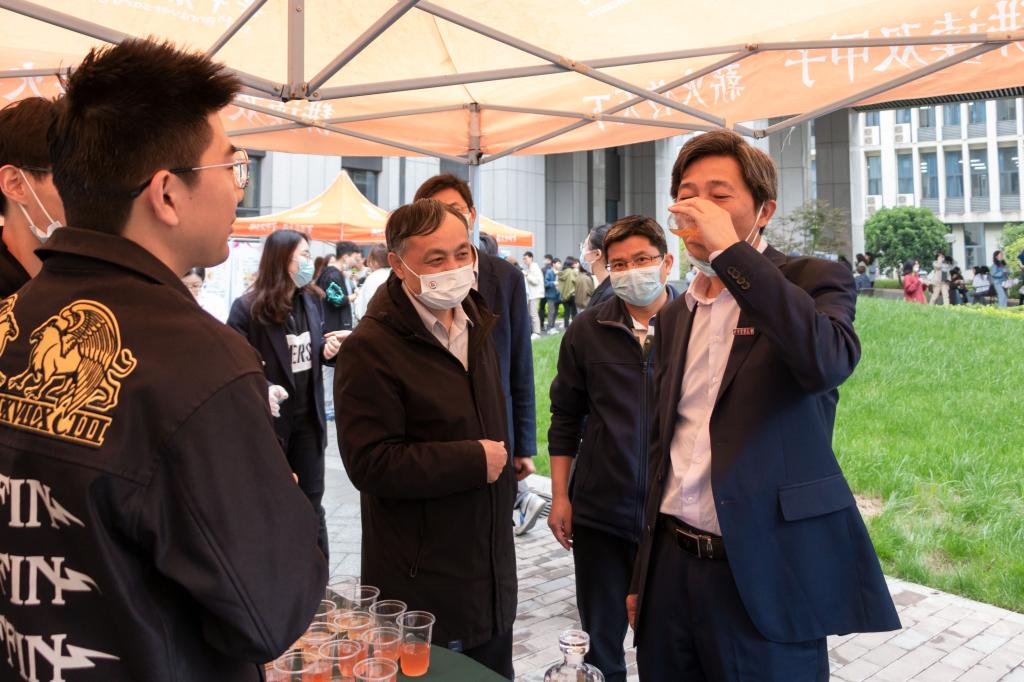 “我国古代的饮料酒主要是黄酒和白酒......”美食小铺里,范占雷热情地邀请同学们品尝各种口味的狮山精酿,并向同学们普及发酵工艺的历史传统。酒酿飘香,也吸引了前来参观的高翅老师,高翅在品尝后说到,百香果味的酒很具创新性,希望同学们都能通过对专业知识的学习,将食品创新化。