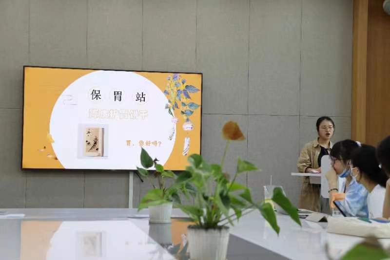 赛前培训会上,学院特意邀请了往届获奖学生代表“保胃站——陈皮护胃饼干”团队的冯小芹分享他们创作产品的经验及注意事项,为今年参赛的学生提供理论指导。