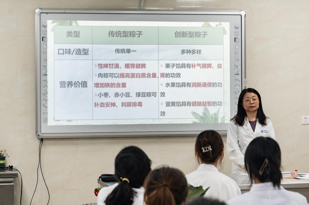 谢定源教授为大家介绍了粽子的营养价值和吃粽子的注意事项。他表示,粽子主要成分是支链淀粉,内馅儿材料多种多样,营养丰富。在吃粽子时,不能空腹食用,也不宜食用过多。同时他说到,传统粽子有豆沙馅猪肉馅等,大多都多糖多油多盐,而近年来一些创新型粽子不断朝着更健康的方向发展。他表示,为了迎合大众对食品健康与营养更高的需求,我院开设新专业即食品营养与健康专业。接着,徐晓云就我院新专业进行讲解。她指出,新专业的设置顺应产业发展,在良好师资力量的支持下,她相信新专业能够办得有质量、有特色。