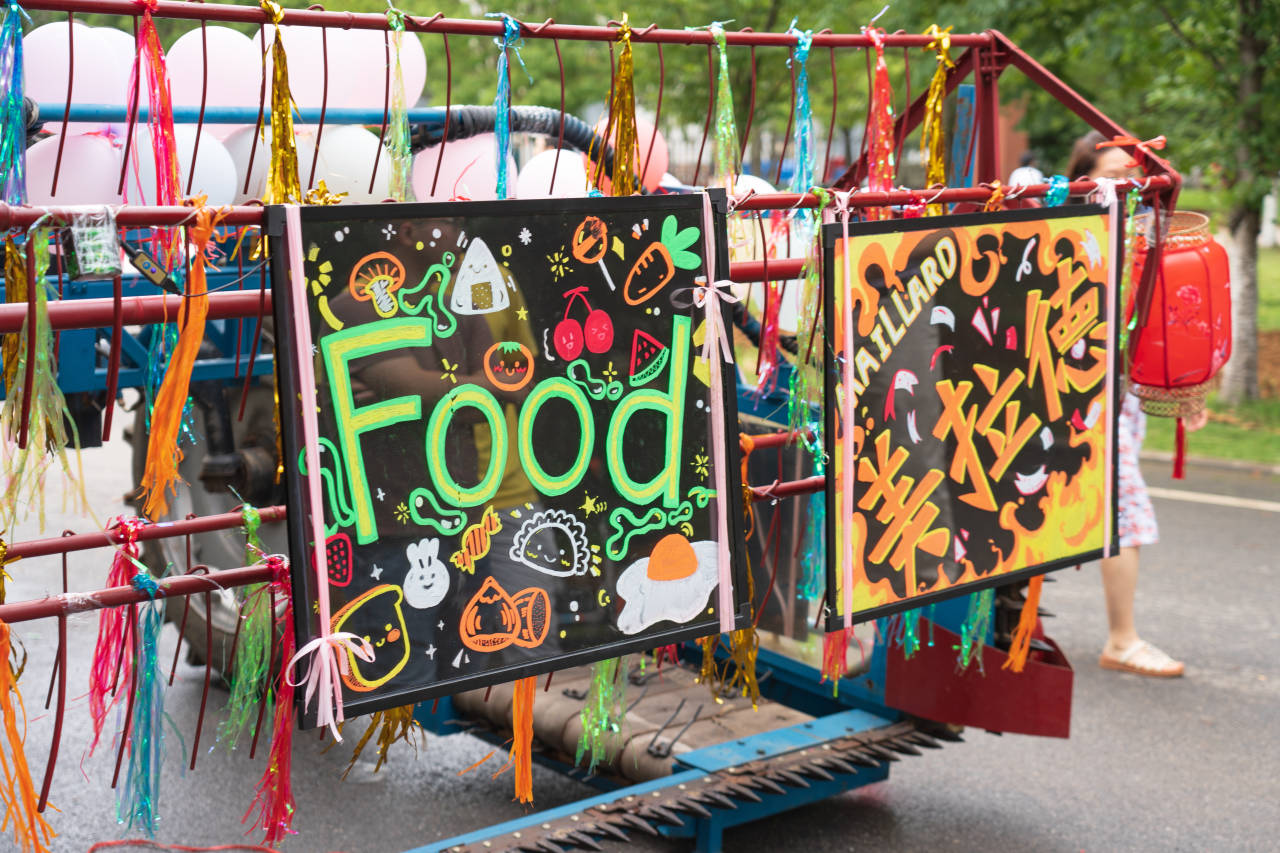下午六点半,巡游队伍集结完毕,各学院按照“工科基地–荟园主干道–狮子山广场”的路线有序前进。我院的机械农机位于巡游队伍的六号位置,农机前方宽大的装饰牌上分别写着代表食科专业的“Food”和“美拉德”字样;农机的滚轮上装饰着彩色条带、气球和灯笼,红色的车身贴着“调和鼎鼐,知味天下”独属于食科人的标语,车后悬挂着各式蔬菜形状的气球,这辆由我院师生共同装扮的“美拉德”号农机,凸显食科特色,彰显食科风采。农机两旁,我院师生手持五彩气球,头戴荧光环,热情洋溢,活力满满,跟随车辆缓缓前进。