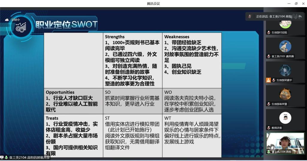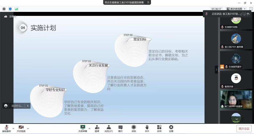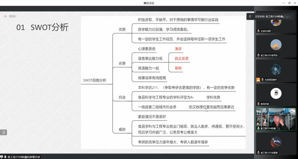 来自食工类2101班的唐英薇从职业自我分析和计划实施两方面来进行演讲,运用学校的职业分析测评平台,结合家庭环境、学校环境、社会环境和职业环境确定自己未来的理想职位,进而确定自己的大学计划和人生规划,向人生目标大踏步前进。