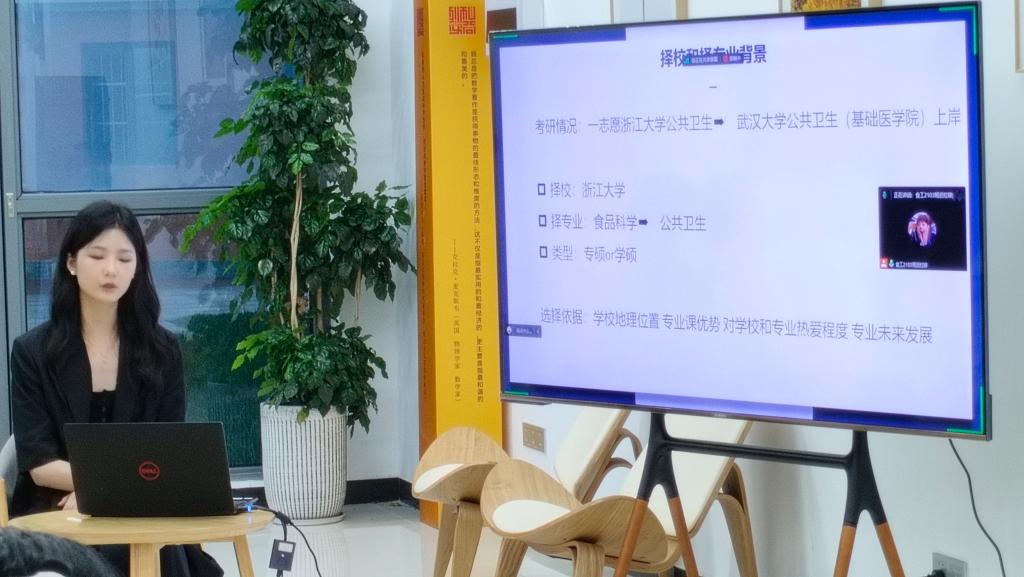 陈柯涵首先就“为什么决定考研?”这一问题展开。她基于个人学习情况,讲述从“保研、留学、考研”三个选择中做出决定的心路历程,为同学们提供参考经验,建议同学们结合个人情况,慎重做出选择。她结合自己的复试经验,建议大家在参加面试前提前了解各个院校的复试风格与流程,做好准备。她为大家详细剖析了自己的备考过程,以英语、政治两个学科为例,向大家分享自己的学习方法。陈柯涵建议大家一定要根据个人情况选择最适合自己的学习方式,不随波逐流,即使在备考过程中感到焦虑与孤单,也要坚持到最后一刻。