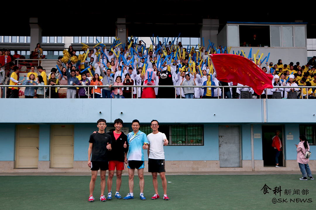 作为学生辅导员的刘超今年已经是第三年参加4*100m男子接力赛,同时,他也是此次男子接力赛决赛的第一棒,张卓和侯涛分别作为第二棒与第三棒,向异之作为此次接力赛的最后一棒。由于食科处于内道,起跑位点相对靠后,信号枪打响后,刘超奋力向前,距离瞬间被拉平,并隐隐有了超越之势。而在接力棒的交接方面,四人也配合得十分默契,整个比赛过程进行得相当顺利。