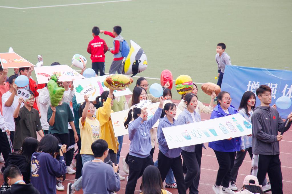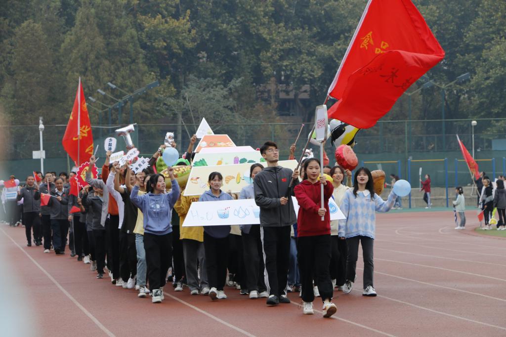 此次运动会,我院运动员代表队方阵设计从营养膳食宝塔中汲取灵感,我院将营养膳食宝塔带到了运动场上,寓意着运动、营养与健康三者的有机结合。同学们整齐排列,分别手持营养膳食宝塔第一层至第六层的KT板,以此传达食品营养健康的理念;老师们紧随其后,将手中的五星红旗随风挥动,高举“健康中国”字样,向观众们展示了积极向上的食科风采,表现了食科人传递食品安全理念、助力健康中国建设的坚定决心。