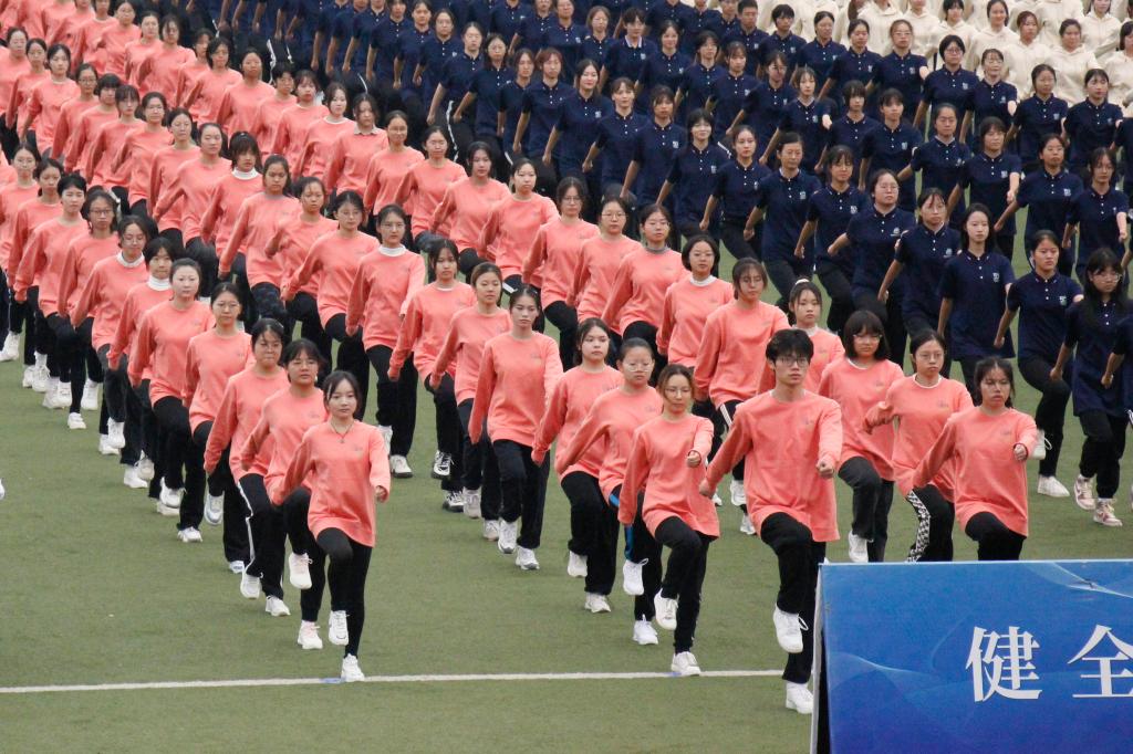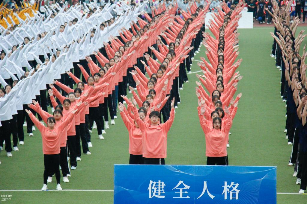 随后,由各院新生组成的广播操方阵入场,雨点拍打浇不灭同学们似火的热情,他们灿烂的笑容洋溢着青春的气息,整齐划一的动作展示着青春的风采。我院新生统一身着橙色上衣,黑色长裤,队列整齐,动作规范,他们的每一次抬手,每一个踢腿,都充满了青春的蓬勃朝气,将赛前刻苦训练的成果淋漓尽致地展现在大家面前。