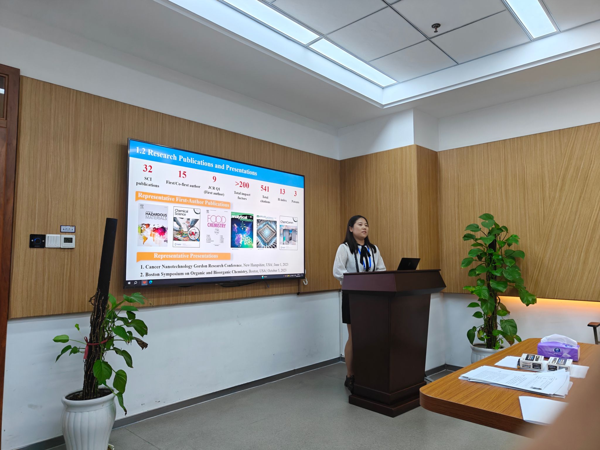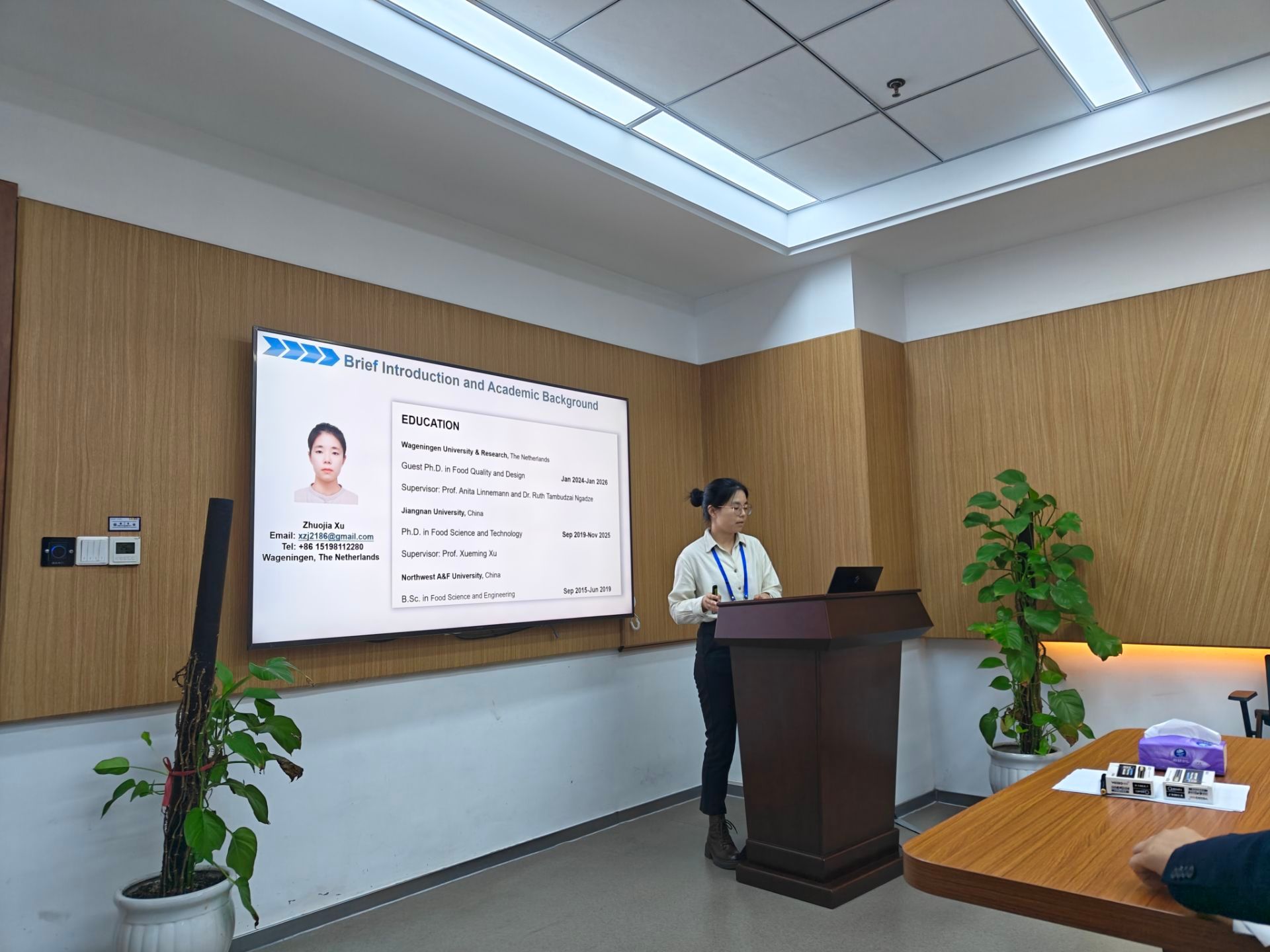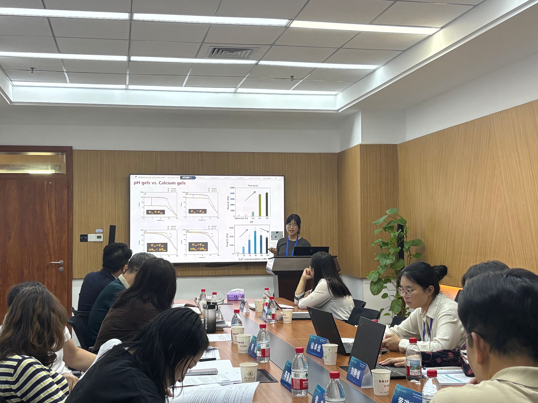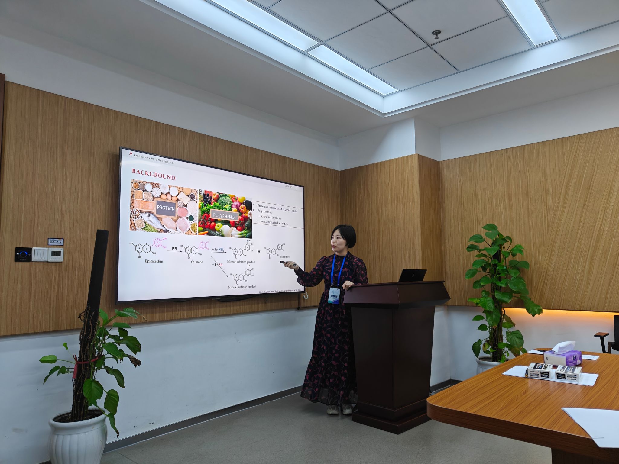 随后,在学术汇报环节,4位参会学者分别围绕纳米传感器技术应用、生物工艺提质、豌豆蛋白特性、蛋白修饰研究等领域开展汇报交流。姜名荻博士以纳米聚合物传感器阵列:从化学检测到细胞诊断与药物筛选为题,揭示了痕量农药诱导的免疫细胞表型变化,并将该方法拓展至相关疾病的早期诊断与药物筛选。通过构建“污染暴露—生物响应—疾病识别”一体化监测体系,有效推动了纳米材料在医疗健康与环境安全交叉领域的应用。徐卓佳博士基于生物工艺的食品品质提升策略,聚焦于功能性产物的生物提取与开发和生物工艺在食品加工中的直接应用,通过模拟消化实验,评估了苋菜、珍珠粟、高粱等原料在不同处理条件下的营养组成、质构特性及消化率,支持了营养强化型食品的开发。任文博博士通过讲解钙诱导豌豆蛋白凝胶的结构及其营养特性,以豌豆蛋白为对象,系统探讨不同理化条件和加工参数(钙浓度、pH、加热温度与时间、剪切力)下,豌豆蛋白从可溶性胶体聚集体到交联网络的形成过程。通过结构表征和体外消化实验,揭示了凝胶结构特征与营养特性(蛋白消化性、钙离子生物可及性)之间关系。刘静媛博士以多酚基蛋白质改性:氨基酸的反应性及改性产物生物活性评价展示了其最新研究,她讲到植物多酚具有抗氧化和抗炎特性。氧化形式的酚酸,如邻苯二酚,可以通过与食品中的蛋白质亲核基团反应形成多酚-蛋白质加合物。