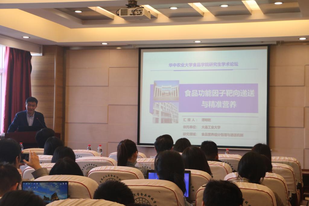 在学术报告期间,谭明乾教授做了“食品功能因子靶向递送与精准营养”主题报告。他从营养失衡原因的角度入手,介绍了精准营养的研究手段与干预方法,从花色苷、花青素等实物出发,阐述了食品功能因子靶向递送面临的问题、发展动态及机遇与挑战。他强调,我们要利用食品科技,担起保障人民营养健康的责任。报告结束后,现场师生就精准营养靶向递送进行了交流讨论。针对羊肉串碳链越多,越有香味,毒性也越多的研究,有同学提出是否所有人都不需要宵夜,只需冲泡代餐功能因子冲剂,谭教授回答道,切忌一刀切,功能食品满足特定人群即可。