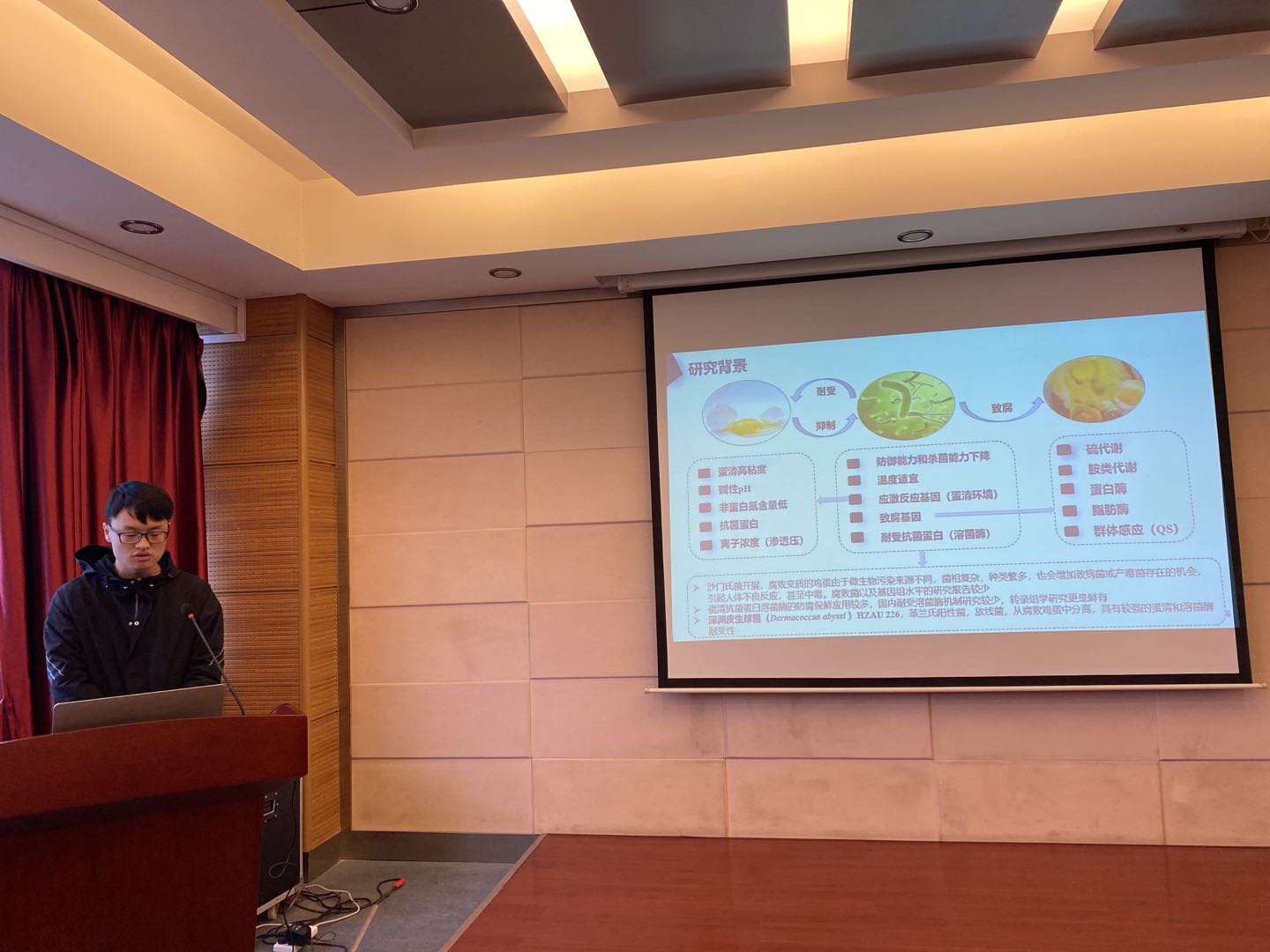 丁礼贤硕士介绍了超临界二氧化碳处理对蛋清蛋白起泡性及理化特性的影响机理研究,这对蛋品加工企业的生产具有积极的意义;孟雅祺硕士讲述了鸭蛋蛋清及蛋黄的N-糖蛋白组学鉴定比较分析相关内容;阮瑶硕士汇报了普洱茶水提取物健康生理功效的研究;王丽丽硕士分享在不同加工方式下大米淀粉的多尺度结构变化与慢消化机制研究,并提出慢消化和抗性淀粉可以降低与饮食有关疾病的风险有益于人体营养与健康;万力硕士介绍了超高压介导的柑橘果胶改性及其功能评价,结果表明超高压介导的柑橘果胶在凝胶特性等方面表现出良好的加工特性。