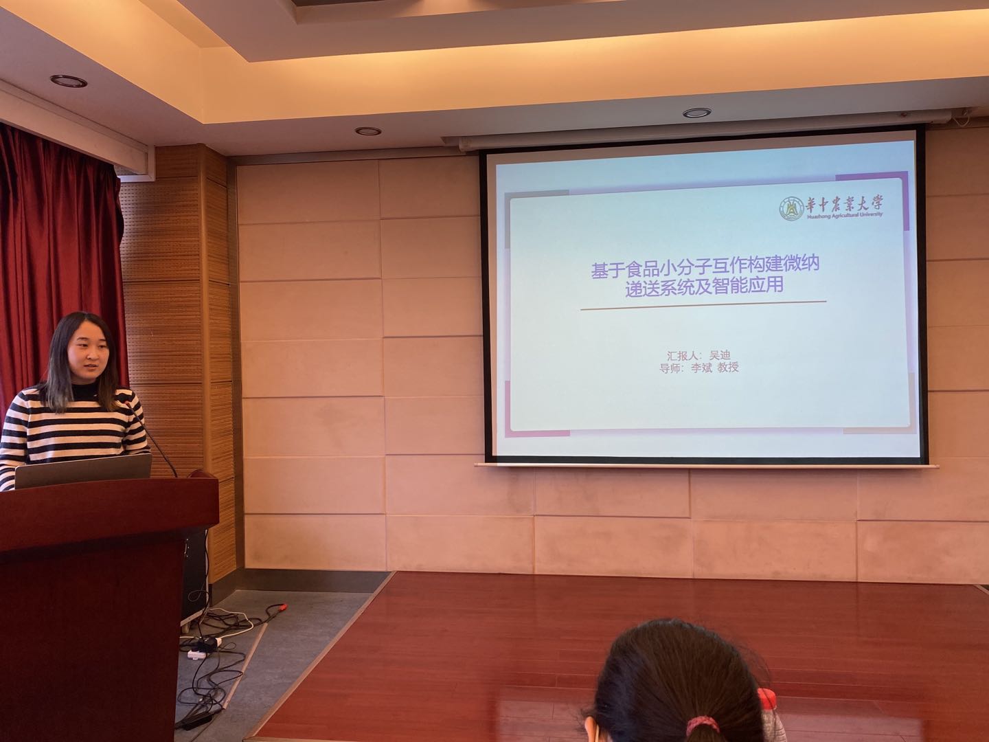 所有的参赛者从不同的领域和角度为我们分享各自的科研内容以及研究成果。吴迪博士为我们介绍了基于食品小分子互作构建微纳递送系统及智能应用。出于对健康食品的追求和功能因子稳态化研究的两个原因,她研究了利用多酚-金属离子界面组装对川陈皮素稳态化及生物学性质的保护作用,结果证明酚-金属离子界面组装对川陈皮素的稳定性和生物学特性的保护作用均有相应的提高。魏雪团副教授在最后为吴迪博士提出了宝贵意见,他建议吴迪博士应该更充分考虑这种酚-金属离子界面组装的保护作用与食品的结合,如果可以通过口服能发挥作用就更加有意义。