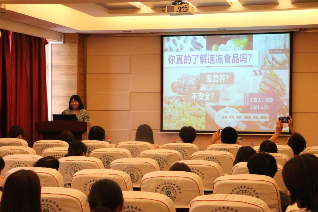 “饺·与君说”队从速冻食品发展趋势和速冻食品在食品工业中的重要地位入手,讲述了速冻新型食品的健康食用指南。该团队介绍了市面上的新型速冻食品,有着零脂零糖、低脂高纤维、含有功能性成分等特点,重点介绍了低脂高纤维食品植物肉、“青稞君”、“魔芋君”三种产品,以套圈游戏、提问互动的形式加深了大家对新型速冻食品的认识。“速冻食品有哪些呢?”“速冻食品后援会”队以翻牌子、观看食品的形式,带大家认识速冻食品,了解速冻食品的消费情况、消费趋势以及人们对速冻食品的误区“速冻食品营养会流失吗?”、“速冻食品应该怎样解冻呢?”、“速冻食品放进冰箱就万事大吉了吗?”针对大家都很好奇的问题,该团队做了一一的科普。“速冻食品的营养基本不会流失,甚至在某些情况下营养甚至更高;速冻食品要根据食物的大小、种类,提前将食物放在冷藏室解冻;速冻食品不宜放太久,最好要在两个月内吃掉。”